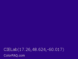 CIELab 17.26,48.624,-60.017 Color is a dark indigo color and the nearest color is Blue Gem #2c0e8c. Hex code #2f0484 and RGB value is rgb(47,4,132). In RGB color space, this color is composed of 18% red, 2% green, 52% blue, In CMYK color space, this color is composed of 64% cyan, 97% magenta, 0% yellow , 48% black , In HSL color space, this color has a hue angle of 260° , 94% saturation and 27% lightness.