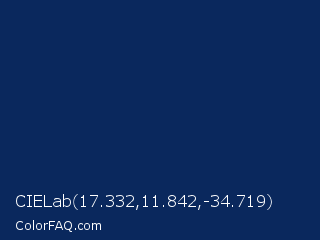 CIELab 17.332,11.842,-34.719 Color is a very dark blue color and the nearest color is Madison #09255d. Hex code #0a285d and RGB value is rgb(10,40,93). In RGB color space, this color is composed of 4% red, 16% green, 36% blue, In CMYK color space, this color is composed of 89% cyan, 57% magenta, 0% yellow , 64% black , In HSL color space, this color has a hue angle of 218° , 81% saturation and 20% lightness.