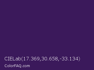 CIELab 17.369,30.658,-33.134 Color is a dark purple color and the nearest color is Scarlet Gum #431560. Hex code #3b195b and RGB value is rgb(59,25,91). In RGB color space, this color is composed of 23% red, 10% green, 36% blue, In CMYK color space, this color is composed of 35% cyan, 73% magenta, 0% yellow , 64% black , In HSL color space, this color has a hue angle of 271° , 57% saturation and 23% lightness.