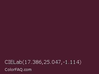 CIELab 17.386,25.047,-1.114 Color is a very dark rose color and the nearest color is Crater Brown #462425. Hex code #4a1a2d and RGB value is rgb(74,26,45). In RGB color space, this color is composed of 29% red, 10% green, 18% blue, In CMYK color space, this color is composed of 0% cyan, 65% magenta, 39% yellow , 71% black , In HSL color space, this color has a hue angle of 336° , 48% saturation and 20% lightness.
