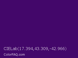CIELab 17.394,43.309,-42.966 Color is a very dark purple color and the nearest color is Blue Diamond #380474. Hex code #43076a and RGB value is rgb(67,7,106). In RGB color space, this color is composed of 26% red, 3% green, 42% blue, In CMYK color space, this color is composed of 37% cyan, 93% magenta, 0% yellow , 58% black , In HSL color space, this color has a hue angle of 276° , 88% saturation and 22% lightness.