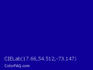 CIELab 17.66,54.512,-73.147 Color is a dark indigo color and the nearest color is Ultramarine #120a8f. Hex code #10009a and RGB value is rgb(16,0,154). In RGB color space, this color is composed of 6% red, 0% green, 60% blue, In CMYK color space, this color is composed of 90% cyan, 100% magenta, 0% yellow , 40% black , In HSL color space, this color has a hue angle of 246° , 100% saturation and 30% lightness.