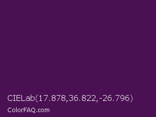 CIELab 17.878,36.822,-26.796 Color is a very dark magenta color and the nearest color is Clairvoyant #480656. Hex code #4b1053 and RGB value is rgb(75,16,83). In RGB color space, this color is composed of 29% red, 6% green, 33% blue, In CMYK color space, this color is composed of 10% cyan, 81% magenta, 0% yellow , 67% black , In HSL color space, this color has a hue angle of 293° , 68% saturation and 19% lightness.