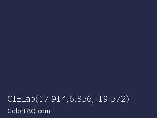 CIELab 17.914,6.856,-19.572 Color is a very dark blue color and the nearest color is Yankees Blue #1c2841. Hex code #242a48 and RGB value is rgb(36,42,72). In RGB color space, this color is composed of 14% red, 16% green, 28% blue, In CMYK color space, this color is composed of 50% cyan, 42% magenta, 0% yellow , 72% black , In HSL color space, this color has a hue angle of 230° , 33% saturation and 21% lightness.