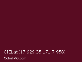 CIELab 17.929,35.171,7.958 Color is a very dark rose color and the nearest color is Bordeaux #5c0120. Hex code #590c22 and RGB value is rgb(89,12,34). In RGB color space, this color is composed of 35% red, 5% green, 13% blue, In CMYK color space, this color is composed of 0% cyan, 87% magenta, 62% yellow , 65% black , In HSL color space, this color has a hue angle of 343° , 76% saturation and 20% lightness.