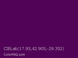 CIELab 17.93,42.905,-29.352 Color is a very dark magenta color and the nearest color is Clairvoyant #480656. Hex code #510357 and RGB value is rgb(81,3,87). In RGB color space, this color is composed of 32% red, 1% green, 34% blue, In CMYK color space, this color is composed of 7% cyan, 97% magenta, 0% yellow , 66% black , In HSL color space, this color has a hue angle of 296° , 93% saturation and 18% lightness.