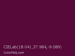 CIELab 18.041,37.984,-9.089 Color is a very dark magenta color and the nearest color is Mulberry Wood #5c0536. Hex code #57093a and RGB value is rgb(87,9,58). In RGB color space, this color is composed of 34% red, 4% green, 23% blue, In CMYK color space, this color is composed of 0% cyan, 90% magenta, 33% yellow , 66% black , In HSL color space, this color has a hue angle of 322° , 81% saturation and 19% lightness.