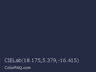 CIELab 18.175,5.379,-16.415 Color is a very dark blue color and the nearest color is Ebony Clay #26283b. Hex code #262b44 and RGB value is rgb(38,43,68). In RGB color space, this color is composed of 15% red, 17% green, 27% blue, In CMYK color space, this color is composed of 44% cyan, 37% magenta, 0% yellow , 73% black , In HSL color space, this color has a hue angle of 230° , 28% saturation and 21% lightness.