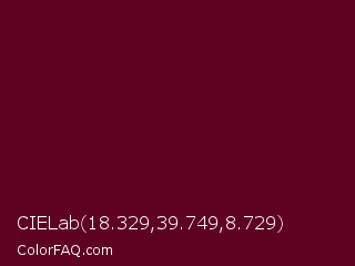 CIELab 18.329,39.749,8.729 Color is a very dark rose color and the nearest color is Bordeaux #5c0120. Hex code #5f0222 and RGB value is rgb(95,2,34). In RGB color space, this color is composed of 37% red, 1% green, 13% blue, In CMYK color space, this color is composed of 0% cyan, 98% magenta, 64% yellow , 63% black , In HSL color space, this color has a hue angle of 339° , 96% saturation and 19% lightness.
