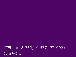 CIELab 18.383,44.637,-37.992 Color is a very dark purple color and the nearest color is Clairvoyant #480656. Hex code #4d0465 and RGB value is rgb(77,4,101). In RGB color space, this color is composed of 30% red, 2% green, 40% blue, In CMYK color space, this color is composed of 24% cyan, 96% magenta, 0% yellow , 60% black , In HSL color space, this color has a hue angle of 285° , 92% saturation and 21% lightness.
