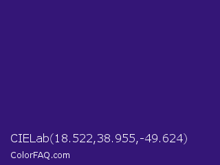 CIELab 18.522,38.955,-49.624 Color is a dark indigo color and the nearest color is Persian Indigo #32127a. Hex code #341677 and RGB value is rgb(52,22,119). In RGB color space, this color is composed of 20% red, 9% green, 47% blue, In CMYK color space, this color is composed of 56% cyan, 82% magenta, 0% yellow , 53% black , In HSL color space, this color has a hue angle of 259° , 69% saturation and 28% lightness.