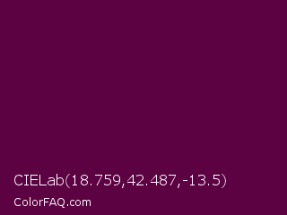 CIELab 18.759,42.487,-13.5 Color is a very dark magenta color and the nearest color is Pompadour #660045. Hex code #5c0142 and RGB value is rgb(92,1,66). In RGB color space, this color is composed of 36% red, 0% green, 26% blue, In CMYK color space, this color is composed of 0% cyan, 99% magenta, 28% yellow , 64% black , In HSL color space, this color has a hue angle of 317° , 98% saturation and 18% lightness.