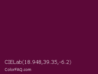 CIELab 18.948,39.35,-6.2 Color is a very dark magenta color and the nearest color is Mulberry Wood #5c0536. Hex code #5c0838 and RGB value is rgb(92,8,56). In RGB color space, this color is composed of 36% red, 3% green, 22% blue, In CMYK color space, this color is composed of 0% cyan, 91% magenta, 39% yellow , 64% black , In HSL color space, this color has a hue angle of 326° , 84% saturation and 20% lightness.