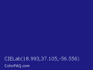 CIELab 18.993,37.105,-56.556 Color is a normal indigo color and the nearest color is Jacksons Purple #20208d. Hex code #1e1c83 and RGB value is rgb(30,28,131). In RGB color space, this color is composed of 12% red, 11% green, 51% blue, In CMYK color space, this color is composed of 77% cyan, 79% magenta, 0% yellow , 49% black , In HSL color space, this color has a hue angle of 241° , 65% saturation and 31% lightness.