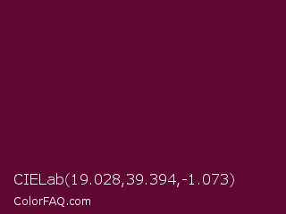 CIELab 19.028,39.394,-1.073 Color is a very dark rose color and the nearest color is Mulberry Wood #5c0536. Hex code #5e0731 and RGB value is rgb(94,7,49). In RGB color space, this color is composed of 37% red, 3% green, 19% blue, In CMYK color space, this color is composed of 0% cyan, 93% magenta, 48% yellow , 63% black , In HSL color space, this color has a hue angle of 331° , 86% saturation and 20% lightness.