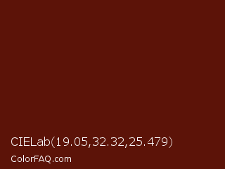 CIELab 19.05,32.32,25.479 Color is a very dark red color and the nearest color is Redwood #5d1e0f. Hex code #5c1308 and RGB value is rgb(92,19,8). In RGB color space, this color is composed of 36% red, 7% green, 3% blue, In CMYK color space, this color is composed of 0% cyan, 79% magenta, 91% yellow , 64% black , In HSL color space, this color has a hue angle of 8° , 84% saturation and 20% lightness.
