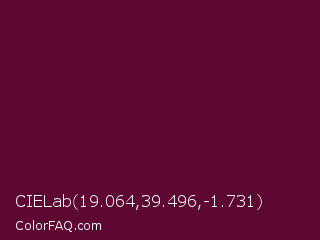 CIELab 19.064,39.496,-1.731 Color is a very dark rose color and the nearest color is Mulberry Wood #5c0536. Hex code #5e0732 and RGB value is rgb(94,7,50). In RGB color space, this color is composed of 37% red, 3% green, 20% blue, In CMYK color space, this color is composed of 0% cyan, 93% magenta, 47% yellow , 63% black , In HSL color space, this color has a hue angle of 330° , 86% saturation and 20% lightness.