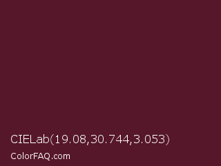 CIELab 19.08,30.744,3.053 Color is a very dark rose color and the nearest color is Wine Berry #591d35. Hex code #56172b and RGB value is rgb(86,23,43). In RGB color space, this color is composed of 34% red, 9% green, 17% blue, In CMYK color space, this color is composed of 0% cyan, 73% magenta, 50% yellow , 66% black , In HSL color space, this color has a hue angle of 341° , 58% saturation and 21% lightness.