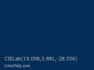 CIELab 19.098,3.881,-28.556 Color is a very dark blue color and the nearest color is Prussian Blue #003153. Hex code #052f58 and RGB value is rgb(5,47,88). In RGB color space, this color is composed of 2% red, 18% green, 35% blue, In CMYK color space, this color is composed of 94% cyan, 47% magenta, 0% yellow , 65% black , In HSL color space, this color has a hue angle of 210° , 89% saturation and 18% lightness.