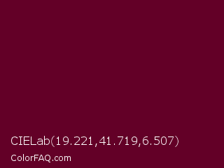 CIELab 19.221,41.719,6.507 Color is a very dark rose color and the nearest color is Black Rose #67032d. Hex code #630027 and RGB value is rgb(99,0,39). In RGB color space, this color is composed of 39% red, 0% green, 15% blue, In CMYK color space, this color is composed of 0% cyan, 100% magenta, 61% yellow , 61% black , In HSL color space, this color has a hue angle of 336° , 100% saturation and 19% lightness.