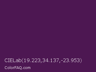 CIELab 19.223,34.137,-23.953 Color is a very dark magenta color and the nearest color is Scarlet Gum #431560. Hex code #4d1752 and RGB value is rgb(77,23,82). In RGB color space, this color is composed of 30% red, 9% green, 32% blue, In CMYK color space, this color is composed of 6% cyan, 72% magenta, 0% yellow , 68% black , In HSL color space, this color has a hue angle of 295° , 56% saturation and 21% lightness.