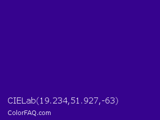 CIELab 19.234,51.927,-63 Color is a dark violet color and the nearest color is Blue Gem #2c0e8c. Hex code #36038e and RGB value is rgb(54,3,142). In RGB color space, this color is composed of 21% red, 1% green, 56% blue, In CMYK color space, this color is composed of 62% cyan, 98% magenta, 0% yellow , 44% black , In HSL color space, this color has a hue angle of 262° , 96% saturation and 28% lightness.