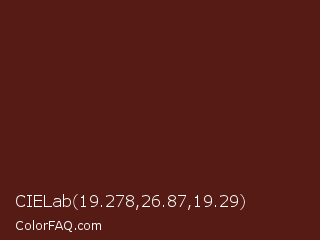 CIELab 19.278,26.87,19.29 Color is a very dark red color and the nearest color is Redwood #5d1e0f. Hex code #561b14 and RGB value is rgb(86,27,20). In RGB color space, this color is composed of 34% red, 11% green, 8% blue, In CMYK color space, this color is composed of 0% cyan, 69% magenta, 77% yellow , 66% black , In HSL color space, this color has a hue angle of 6° , 62% saturation and 21% lightness.