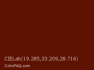 CIELab 19.285,33.209,28.716 Color is a very dark red color and the nearest color is Dark Tan #661010. Hex code #5e1201 and RGB value is rgb(94,18,1). In RGB color space, this color is composed of 37% red, 7% green, 0% blue, In CMYK color space, this color is composed of 0% cyan, 81% magenta, 99% yellow , 63% black , In HSL color space, this color has a hue angle of 11° , 98% saturation and 19% lightness.