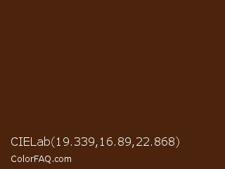 CIELab 19.339,16.89,22.868 Color is a very dark orange color and the nearest color is Brown Derby #492615. Hex code #4c240d and RGB value is rgb(76,36,13). In RGB color space, this color is composed of 30% red, 14% green, 5% blue, In CMYK color space, this color is composed of 0% cyan, 53% magenta, 83% yellow , 70% black , In HSL color space, this color has a hue angle of 22° , 71% saturation and 17% lightness.