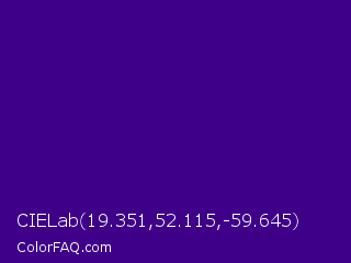 CIELab 19.351,52.115,-59.645 Color is a dark violet color and the nearest color is Kingfisher Daisy #3e0480. Hex code #3e0089 and RGB value is rgb(62,0,137). In RGB color space, this color is composed of 24% red, 0% green, 54% blue, In CMYK color space, this color is composed of 55% cyan, 100% magenta, 0% yellow , 46% black , In HSL color space, this color has a hue angle of 267° , 100% saturation and 27% lightness.