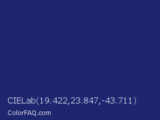 CIELab 19.422,23.847,-43.711 Color is a dark blue color and the nearest color is St Patricks Blue #23297a. Hex code #1f2670 and RGB value is rgb(31,38,112). In RGB color space, this color is composed of 12% red, 15% green, 44% blue, In CMYK color space, this color is composed of 72% cyan, 66% magenta, 0% yellow , 56% black , In HSL color space, this color has a hue angle of 235° , 57% saturation and 28% lightness.