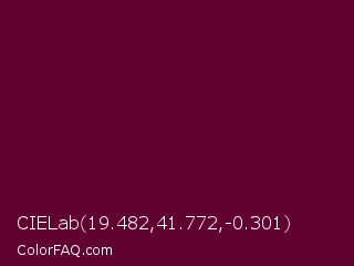 CIELab 19.482,41.772,-0.301 Color is a very dark rose color and the nearest color is Black Rose #67032d. Hex code #620231 and RGB value is rgb(98,2,49). In RGB color space, this color is composed of 38% red, 1% green, 19% blue, In CMYK color space, this color is composed of 0% cyan, 98% magenta, 50% yellow , 62% black , In HSL color space, this color has a hue angle of 331° , 96% saturation and 20% lightness.