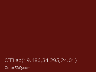 CIELab 19.486,34.295,24.01 Color is a very dark red color and the nearest color is Dark Tan #661010. Hex code #5f110d and RGB value is rgb(95,17,13). In RGB color space, this color is composed of 37% red, 7% green, 5% blue, In CMYK color space, this color is composed of 0% cyan, 82% magenta, 86% yellow , 63% black , In HSL color space, this color has a hue angle of 3° , 76% saturation and 21% lightness.
