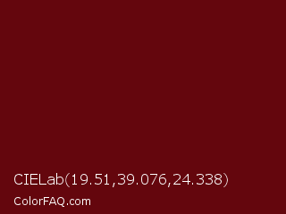 CIELab 19.51,39.076,24.338 Color is a very dark red color and the nearest color is Rosewood #65000b. Hex code #64060d and RGB value is rgb(100,6,13). In RGB color space, this color is composed of 39% red, 2% green, 5% blue, In CMYK color space, this color is composed of 0% cyan, 94% magenta, 87% yellow , 61% black , In HSL color space, this color has a hue angle of 356° , 89% saturation and 21% lightness.