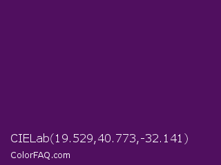 CIELab 19.529,40.773,-32.141 Color is a very dark purple color and the nearest color is Scarlet Gum #431560. Hex code #500f5f and RGB value is rgb(80,15,95). In RGB color space, this color is composed of 31% red, 6% green, 37% blue, In CMYK color space, this color is composed of 16% cyan, 84% magenta, 0% yellow , 63% black , In HSL color space, this color has a hue angle of 289° , 73% saturation and 22% lightness.