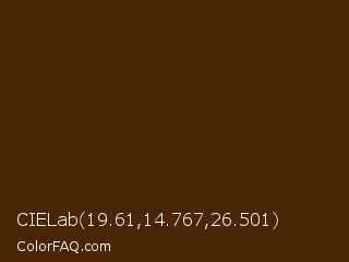 CIELab 19.61,14.767,26.501 Color is a very dark orange color and the nearest color is Bracken #4a2a04. Hex code #4b2605 and RGB value is rgb(75,38,5). In RGB color space, this color is composed of 29% red, 15% green, 2% blue, In CMYK color space, this color is composed of 0% cyan, 49% magenta, 93% yellow , 71% black , In HSL color space, this color has a hue angle of 28° , 88% saturation and 16% lightness.