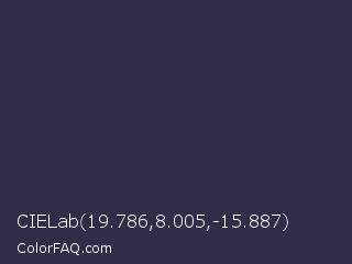 CIELab 19.786,8.005,-15.887 Color is a dark indigo color and the nearest color is Tuna #353542. Hex code #2f2d47 and RGB value is rgb(47,45,71). In RGB color space, this color is composed of 18% red, 18% green, 28% blue, In CMYK color space, this color is composed of 34% cyan, 37% magenta, 0% yellow , 72% black , In HSL color space, this color has a hue angle of 245° , 22% saturation and 23% lightness.
