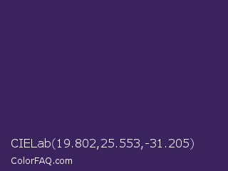 CIELab 19.802,25.553,-31.205 Color is a dark violet color and the nearest color is Jacarta #3a2a6a. Hex code #3b235e and RGB value is rgb(59,35,94). In RGB color space, this color is composed of 23% red, 14% green, 37% blue, In CMYK color space, this color is composed of 37% cyan, 63% magenta, 0% yellow , 63% black , In HSL color space, this color has a hue angle of 264° , 46% saturation and 25% lightness.