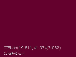 CIELab 19.811,41.934,3.082 Color is a very dark rose color and the nearest color is Black Rose #67032d. Hex code #64022d and RGB value is rgb(100,2,45). In RGB color space, this color is composed of 39% red, 1% green, 18% blue, In CMYK color space, this color is composed of 0% cyan, 98% magenta, 55% yellow , 61% black , In HSL color space, this color has a hue angle of 334° , 96% saturation and 20% lightness.