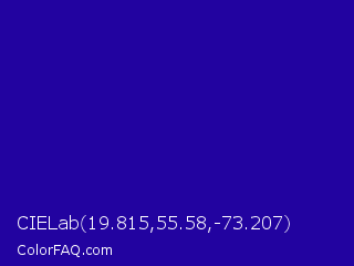 CIELab 19.815,55.58,-73.207 Color is a normal indigo color and the nearest color is Ultramarine #120a8f. Hex code #2203a0 and RGB value is rgb(34,3,160). In RGB color space, this color is composed of 13% red, 1% green, 63% blue, In CMYK color space, this color is composed of 79% cyan, 98% magenta, 0% yellow , 37% black , In HSL color space, this color has a hue angle of 252° , 96% saturation and 32% lightness.
