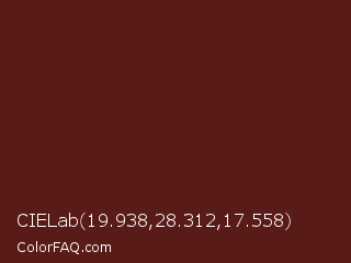 CIELab 19.938,28.312,17.558 Color is a very dark red color and the nearest color is Redwood #5d1e0f. Hex code #591b18 and RGB value is rgb(89,27,24). In RGB color space, this color is composed of 35% red, 11% green, 9% blue, In CMYK color space, this color is composed of 0% cyan, 70% magenta, 73% yellow , 65% black , In HSL color space, this color has a hue angle of 3° , 58% saturation and 22% lightness.