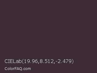 CIELab 19.96,8.512,-2.479 Color is a very dark rose color and the nearest color is Dune #383533. Hex code #3b2c34 and RGB value is rgb(59,44,52). In RGB color space, this color is composed of 23% red, 17% green, 20% blue, In CMYK color space, this color is composed of 0% cyan, 25% magenta, 12% yellow , 77% black , In HSL color space, this color has a hue angle of 328° , 15% saturation and 20% lightness.
