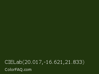 CIELab 20.017,-16.621,21.833 Color is a very dark green color and the nearest color is Palm Leaf #19330e. Hex code #21360e and RGB value is rgb(33,54,14). In RGB color space, this color is composed of 13% red, 21% green, 5% blue, In CMYK color space, this color is composed of 39% cyan, 0% magenta, 74% yellow , 79% black , In HSL color space, this color has a hue angle of 92° , 59% saturation and 13% lightness.
