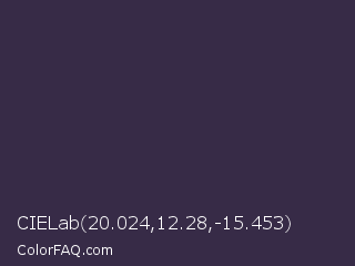 CIELab 20.024,12.28,-15.453 Color is a very dark violet color and the nearest color is Martinique #363050. Hex code #372b47 and RGB value is rgb(55,43,71). In RGB color space, this color is composed of 22% red, 17% green, 28% blue, In CMYK color space, this color is composed of 23% cyan, 39% magenta, 0% yellow , 72% black , In HSL color space, this color has a hue angle of 266° , 25% saturation and 22% lightness.