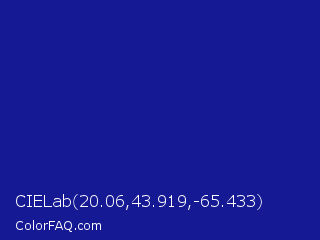 CIELab 20.06,43.919,-65.433 Color is a normal blue color and the nearest color is Jacksons Purple #20208d. Hex code #161994 and RGB value is rgb(22,25,148). In RGB color space, this color is composed of 9% red, 10% green, 58% blue, In CMYK color space, this color is composed of 85% cyan, 83% magenta, 0% yellow , 42% black , In HSL color space, this color has a hue angle of 239° , 74% saturation and 33% lightness.