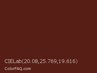 CIELab 20.08,25.769,19.616 Color is a very dark red color and the nearest color is Redwood #5d1e0f. Hex code #571e15 and RGB value is rgb(87,30,21). In RGB color space, this color is composed of 34% red, 12% green, 8% blue, In CMYK color space, this color is composed of 0% cyan, 66% magenta, 76% yellow , 66% black , In HSL color space, this color has a hue angle of 8° , 61% saturation and 21% lightness.