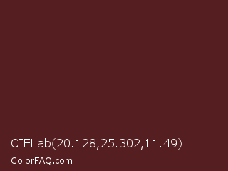 CIELab 20.128,25.302,11.49 Color is a dark red color and the nearest color is Caput Mortuum #592720. Hex code #551f21 and RGB value is rgb(85,31,33). In RGB color space, this color is composed of 33% red, 12% green, 13% blue, In CMYK color space, this color is composed of 0% cyan, 64% magenta, 61% yellow , 67% black , In HSL color space, this color has a hue angle of 358° , 47% saturation and 23% lightness.