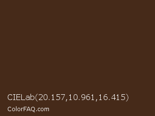 CIELab 20.157,10.961,16.415 Color is a very dark orange color and the nearest color is Brown Derby #492615. Hex code #462a19 and RGB value is rgb(70,42,25). In RGB color space, this color is composed of 27% red, 16% green, 10% blue, In CMYK color space, this color is composed of 0% cyan, 40% magenta, 64% yellow , 73% black , In HSL color space, this color has a hue angle of 23° , 47% saturation and 19% lightness.