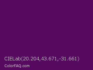 CIELab 20.204,43.671,-31.661 Color is a very dark magenta color and the nearest color is Clairvoyant #480656. Hex code #560a60 and RGB value is rgb(86,10,96). In RGB color space, this color is composed of 34% red, 4% green, 38% blue, In CMYK color space, this color is composed of 10% cyan, 90% magenta, 0% yellow , 62% black , In HSL color space, this color has a hue angle of 293° , 81% saturation and 21% lightness.