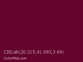 CIELab 20.215,41.693,3.69 Color is a very dark rose color and the nearest color is Black Rose #67032d. Hex code #65042d and RGB value is rgb(101,4,45). In RGB color space, this color is composed of 40% red, 2% green, 18% blue, In CMYK color space, this color is composed of 0% cyan, 96% magenta, 55% yellow , 60% black , In HSL color space, this color has a hue angle of 335° , 92% saturation and 21% lightness.